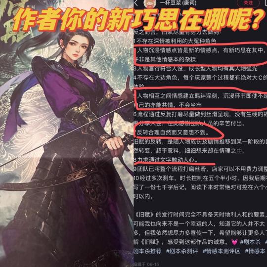 打完再看作者自述,这个本的搞笑程度直线拉升。 好消息:你的玩家哭了 坏消息:你的玩家哭完就清醒咯 融梗本8.2分,究竟是无奈所致,还是未来发展的趋势? 创作人还需要原创精神吗?融梗+按头,一个本=五个本,玩家连连大呼物超所值!! 体验剧本:旧赋 体验角色:阿予 体验店家:御魂殿 带本DM:猫咪 体验时长:7h 个人评分:⭐️⭐️⭐️(都给阿风,小白和阿婆,本不值得) 【吐槽有轻微剧透】 阿予这本能有多少既视感呢? 爱情几乎照搬容雪鸢,你被星星刀过吗?没关系,在这里你甚至可以买到一整套的星星周边。 亲情线那大英雄般的爹爹,让我死去的小乔魂魄又仿佛附体了。 友情线,一花一世界和任贺在匆忙中爬了出来。 家国线,柳浅这混世小魔王这一次来到了梁国。 还有送衣服这个设定,可以不送真的,拉师徒羁绊不一定非要送我一件衣服谢谢。 换而言之, 阿予的爱情不如容雪鸢那自然不如谢泠 阿予的家国不如阿珂娜那自然不如柳浅 阿予的友情哪里必得上任贺一点 阿予的亲情确实不错,爹宝女狂喜 所以,好消息:我哭了 坏消息:哭完我就清醒咯,融梗本多上头一秒就是对原创本的不尊重。 那再说说别的角色,不完全统计,涂川2,寒门,挟剑,一花一世界,山楂林,苍歧,孙策。既视感真的满满,确实能脏哭,什么时候脏哭就是好本了?(也拜托玩家别一天到晚说发差评的玩家就是心测不适合或者车队配置不好,天天把矛头对向自己人,能不能看明白我在说什么) 再来说说流程,最后那段拔花流程真的就差把按头和走流程贴玩家脸上了。我借用一句我们裴决的话“纯爱位希望作者好好阐述爱情的美好和什么是爱,而不是让你以爱之名行绑架之实”。 我想懂的人都懂,也别来说什么适合不适合,他是不是恋爱脑我们车友不比你们清楚? 当然,这还不是最好笑的,最好笑的是接下来我们再来看看作者在xhs的原话。 “任务沉浸情感点皆是新的情感点,有新巧思在其中吗,并非是其他情感本的杂糅” 作者你是否想说这些梗只是碰巧的啊。我都帮你想好理由了,这又不是谁的专利,梗就那么多,只是用到了同样的元素,我没有抄袭缝合或者融梗哦! 你当我没打过其他本是吧?既视感这么浓,为什么别的作者至少一个本里能有新鲜元素,你做不到?还好意思说自己有新巧思,你真的缝合都不会缝?裁缝起码做到超越前者吧! “人物相互之间情感建立羁绊深刻,沉浸环节即使不是自己的也能共情” 开本前店家心里铺设就是这个本封闭。 其次,我阿予就是人物关系C了,跟谁都熟,但也就这样吧。 “反转合理自然而又意想不到” 行,又是一个主观的说法,反正有人猜不到你就赢了对吧作者。 即使我们都很好猜,反正只要有玩家说自己猜不到就行hhhh “力求通过文字触动人心” 不知道怎么说,作者你再加油吧。 综上所述,如果作者你不说这些话,我可能还不至于生气,大不了就是打个融合本而已。这不也能哭吗,对吧。 但你说了这些话,你就得负责,是这个道理对吗?