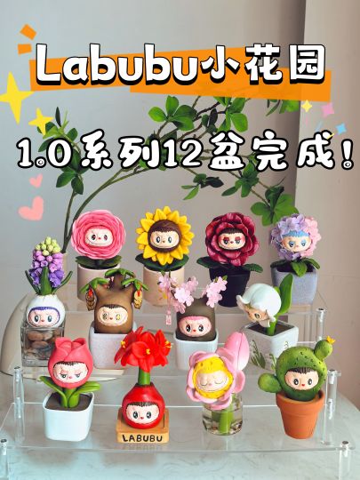 labubu小花园系列1.0 12盆完成!!! 从上到下从左到右分别是: 洋牡丹 向日葵 玫瑰花 绣球花 风信子 摇钱树 桃花树 铃兰花 郁金香 朱顶红 荷花 仙人掌 历时一年半做完了12盆! 好美好美!哈哈哈哈哈 用的都是水果系列的原娃~不是粘土脸不是粘土脸 材质基本都是ab补土~