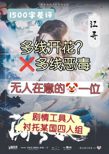 【微剧透,强吐槽】 【强剧透有分割线提示】 开骂❗到底是谁在吹江寻多线开花?情感本玩家已经这么好骗了吗?? 先说结论👇🏻 ①线是多,没一条能吃。 ②真想打,就拿尔宜,青野,仙姑也行。圣尊不了解,可能能爽到,有真实评价也可以说一下,我好奇。 但是江寻迟衡纯小丑,2陪4甚至2陪5,你就打吧,一打一个不吱声。 江寻,姐妹线恶毒,大哥线歹毒,爱情线恶心,没深度的外婆,几笔带过的师父,还有一些莫名其妙的群像,甚至最后大篇幅描写一个不知道有啥用的长嫂,玩家好姐妹甚至和别人羁绊更深! 别谈什么人物内核,表面高冷成熟实际天真废物小女生罢了,加上在场关系就是除了二哥没人要的小破孩(迟衡一边儿去)。 别说是我不吃背刺,情感本背刺总得有人兜底,全场背刺无人在意这么恶心不如删掉江寻好了。 在谈政治的场合谈感情,被迫成为全场焦点,这就是你江寻的C啊?我还不如吃瓜。我袒护的人转头还做些事来恶心我,被别人指点着撕破脸,我不要脸的吗🤡 我和这个国有什么关系?从小流离在外,苦难拜亲人所赐,凭那么几段风景人文,就可以爱这片土地,担起我的责任了?拜托别来沾边。 然后我的群像姐妹有啥用呢?大家好,我是江导游,负责带领咱们姐妹花旅游团,附带针对性就业哦~ 再说流程⚠️,问题很大。前期类跑团又臭又长,拜托店家删减。后期等着谈正事先谈儿女情长,这合理吗?除了剧情转折需要,其他所有不合时宜的输出不如丢最后。流程要实在不会改,改自然点的cue词吧。 文笔将就,但是提个小点,小剧场给我读笑了,江湖≠矫情,这是怕前期太边给我这么多词,也不知道为了突显我啥 🌸优点是整体故事框架其实挺不错的,主线和背景也没毛病,江湖也区别于千篇一律的学院派,换种写法也许这本就优秀了。 仙姑的亲情线在我看来是最好的,爱情不予置评;尔宜的本没啥大的槽点。 🤜反观江寻,晦气的爱情线,下头的npc线,无人在意的玩家姐妹线,不知所云的其他线,敷衍至极!像是为了凑齐三个女的硬塞进剧情缝里的火柴人,随便加两条线,然后为了恰烂钱宣传多线开花……😡江寻(迟衡)们醒醒,非要打我也拦不住,咱确定不要个补贴吗? 前面还以为是那两对霸道总裁强制爱🔗,最后发现原来是这整个本给我强制爱👮🏻♀️。真想逃,下一个就cue你,一个也跑不掉。 ——————注意⚠️强剧透分割线⚠️—————— 如果江寻的本是想要宣扬girls help girls,那么让我们看看我救下来的代表:连翘,干了什么。我和尔宜救她,教她,爱她,委以重任,她最后来一句:别拉连翘啦,连翘脏。 ?????????? 这种不爱惜自己生命的人死了也好,没有责任心,不自爱,究极悲观主义,无脑付出,还想我为她哭?还想拿象牙球刀我?拜托别太荒谬。 抓她杀掉为了救我的迟衡也不是个正常恋人,麻烦都滚一边儿去。 再看看江寻这个人,被人体实验荼毒,月月十五都痛死,还毁了容,最后发现是大哥领导的,俺被抓就是个意外所以不是大哥的错。然后江寻说什么呢:他应该因这件事很痛苦吧……可你怎么会怪他。 o!m!g! 白瞎了北戎这么美这么自由这么平等!你们抓人做人体实验的时候怎么不想想他们也是人他们也有家啊! 深刻怀疑作者三观,江寻最后摇身一变人体实验领导者,这就像被d品迫害的人最后成了制d人和d贩子还毫无愧疚。顺带外婆也为了这么恶劣的事情嗝屁了,这能让我吃到外婆线?我请问呢??????最后江寻怎么配做被人民歌颂的长乐公主啊😱 ——————剧透结束—————— 最后: 💡如果你吃无底线付出,如果你三观不正同流合污助纣为虐,那就来为江寻痛哭吧。 💡如果作者发行需要店家大改特改演绎带动,才能掩盖本烂的事实……啊,我忘了,这不是剧本杀行业的常态了吗。 💡如果你是别的角色,不用来跟我说闻风录这个本有多好。另外两位女生的剧本我看过了,越想越觉得我们只是x国人的陪衬。江寻迟衡的玩家也是人,就活该被骗进来杀!! 谢绝争辩,谢绝洗白,谢谢各位正常人的配合,耶罗。