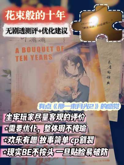 坐牢玩家尽量客观的剧本杀测评 🟠剧本:花束般的十年 🟣类型:欢乐/微醺/纯爱/遗憾/现实向 🔴体验: 🟢0.我们玩的时候全车坐牢,主要扣分点在dm,剧本本身瑕不掩瑜,但也确实有需要优化的地方,作为反面教材尽量客观的评价下。 🔵1.时长:5~6h是黄金体验区间,我们4.5h打完感觉太过仓促不咋沉浸,打5.5h和6h的朋友反响都不错。建议提前了解dm开本时长,是否当天有其他场次,避免因为赶场影响体验。 🟡2.角色:3对cp专注纯爱,没啥亲情,故事简单,爱情上没有生老病死、大悲大苦的BE,三对都是贴近现实的情侣那些事情,纯靠文笔故事落泪的占少数,主要靠现实贴脸破防,尽量选择贴合自身经历的角色,否则可能无法共情或者觉得故事无聊单薄。 ♾️叶潇潇x宋泊简:网恋奔现,相爱但不再合适的恋人,对曾经的牺牲付出产生动摇后悔 ♾️温幼薇x乔野:一见钟情,身份落差,为钱所困,性格敏感和阴差阳错的误会 ♾️林羽x李泽远:青梅竹马,相互救赎,长期异地恋/异国恋,丧失的分享欲,渐行渐远 🟣3.欢乐:情感、欢乐双修的dm是最佳选择。剧情和小程序设计都很有趣,但是小游戏比较简单老套,非熟人车前期很需要dm带动气氛防止冷场,并且通过破冰和玩家建立公共羁绊,否则后期对于dm个人故事玩家不一定会共情、触动。 🟤4.关于坐牢:3对cp故事割裂,纯靠故事分享补全视角。前期欢乐部分的故事分享过于简单,cp间羁绊浅,对其他对故事了解少;后期沉浸,全靠dm话术交代事件和解释误会,除了最后一段自由输出,基本是玩家和dm的对话,玩家交互感弱,情绪被冲淡,而且对其他对来说完全听不明白故事只能玩手机。在我看来,剧本本身底子不错,如果在流程、话术上能再优化下,会有更好的呈现。 ⚪5.关于优化:建议dm借鉴《那一束月光2》的流程,前期欢乐、后期沉浸都根据角色整理各阶段关键词和问题,前期搞明白大家是怎么在一起的,后续沉浸才听得懂其他人故事。黑灯沉浸后,引导玩家自己分享故事,质问和解释误会,更好的宣泄情感和互动交互。推荐选择有经验、会适当优化本的dm。 🔵6.微醺:剧本故事较为简单,需要玩家嗨起来破冰和贴合自身经历破防,适当的酒精更有利于这个本的欢乐和沉浸,不能喝酒也推荐准备饮料。建议选择提供酒水的门店体验,手册也将“一大壶酒”列为必备道具,店家为节省成本没准备时,推荐玩家自备酒水饮料。