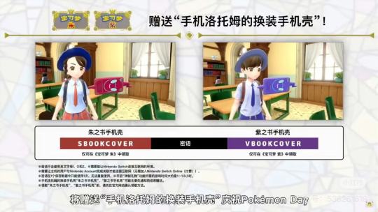 赠送“朱之书手机壳”、“紫之书手机壳”! 2025年2月27日22:00起,为庆祝2月27日的“Pokémon Day”,赠送“朱之书手机壳”、“紫之书手机壳”!在《宝可梦 朱》中可领取“朱之书手机壳”,在《宝可梦 紫》中可领取“紫之书手机壳”。 在菜单选择“宝可入口站”→“神秘礼物”→“通过序列号/密语接收”并输入以下密语即可领取。 ▼朱之书手机壳※仅可在《宝可梦 朱》中领取。SB00KC0VER※不使用英文字母O、I和Z。 ▼紫之书手机壳※仅可在《宝可梦 紫》中领取。VB00KC0VER※不使用英文字母O、I和Z。 期间2025年2月27日22:00开始