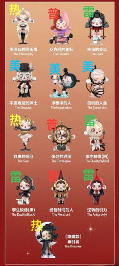 根据自己喜好划分的热款❤️和雷款💣 【热款❤️】 1. 垂目者🌛(隐藏款) 太太太好看啦!而且是大明盒的手感,我打算去门店蹲一蹲碰碰运气。木质的面容,流光的月亮,旋飞的鸟儿~ 2. 猫头鹰🦉 我的天!带上面具简直太绝了,耳球是瞳孔👁️,让整体造型画龙点睛。 3. 翎羽🕊️ 姿态呈现悬于半空,背面牢笼里的白鸽,喜欢白敬亭的一定懂我,那种抵挡不住的魔力。 【美款💗】 1. 绅士🎩 怪诞哥特风格,面具背后是🐑,绅士的礼帽,手中拄着拐杖,翘起的衣角。 2. 浮想🌊 非站立姿态,沉睡于梦境之中,眉心的☪️符号,底座的几颗眼睛👀。 3. 人鱼🧜♀️ 看这它你的思绪会慢慢平静下来,一起闭上眼睛去冥想🧘🏻♀️,自己化身人鱼公主👑… 【普款⚪️】 1. 张弛的时间🕰️ 一整个脑袋瓜子是古老的座钟,可以上发条转到切换眼睛👁️。头够大了,哈哈下半身坐着挺乖巧可爱。 2. 经营时间的人🌞 哈哈死鱼眼睛!那个红尖顶是什么鬼?下身能转还不错,白昼黑夜的交替。 3. 反方向的路标🤡 这个不就是万圣节👻的惊吓盒子嘛,弹簧设计有互动性,配色一般人不会喜欢,但懂它的人自然会懂。 【雷款💣】 1. 孪生映像👯 啊啊啊半个耳球的设计,强迫症必须给他俩凑一对才行!对比其他款没有亮点,天鹅🦢设计的一般般。 2. 摇曳的支点 😓好像拉了一坨大的,再糊上黑黢黢的面罩,不喜欢! 3. 逆转的引力🎈 透明耳球里正反💧设计可以,吹起的裙摆设计可以,但配色我不喜欢,眼妆也挺吓人的啊!