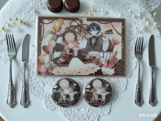 豆包ai背景,不用辛苦布置场景了,口令:背景换成欧式白色桌子,蕾丝雪纺珍珠布,冷调光线,桌子上有精致巧克力马卡龙,银色刀叉左右两边,巧克力色装饰品。