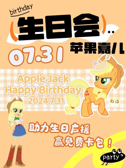 ♡"Equestria's strength grows from its honest roots, and that's you, Applejack." ♡“小马利亚因诚实的根基而茁壮成长,那正是你,苹果嘉儿。” 🦄 世界上总会有疲惫和挑战的时刻 —— ✨ 但坚守信念的,永远是那颗最闪耀的赤诚之心! - 𝐻𝑎𝑝𝑝𝑦 𝐵𝑖𝑟𝑡ℎ𝑑𝑎𝑦 𝑡𝑜 𝐴𝑝𝑝𝑙𝑒𝑗𝑎𝑐𝑘!!! - 🎂 勤劳可靠的苹果嘉儿,生日快乐~ 【参与方式】 🎁 在2025年7月31日之前,在本话题下发帖给苹果嘉儿送上生日祝福的小伙伴都能参与活动!我们将抽取20位幸运儿,每人送出价值10元的卡包(款式随机)! 📢 发帖人数满100将会解锁卡牌岛的大弹窗,让更多人为苹果嘉儿庆生~ 【注意事项】 ⏰ 开奖时间:8月5日本话题内+活动主贴公布,并于当日发送中奖私信。 📅 请中奖用户不晚于8月12日0点登记信息,逾期作废。 🎉 快来为最可靠的农场小马送上祝福吧!🌟🍎