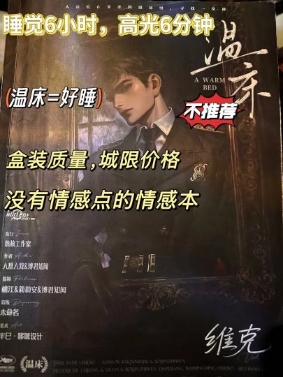 《温床》这个剧本的名字确实取得挺好的👍 直接点题,主打一个好睡; 维克这个角色,睡6个小时之后被车友叫起来念一张稿子就可以结束啦👌 👀真不知道为什么现在的剧本宣传都喜欢用一些特定的词去硬夸; 无聊角色就是需要自沉; 内容不足就是时长友好; 没有情感点就说不是传统情感本; 而《温床》,就是这么一个从头到尾看起来都是盒装质量的体验本; 内容短小、情感枯竭、环节乏味、边C分明; 不建议部分男角色原价体验; ⏰时长:6.5小时; 📖剧本类型:以权利为主题的欧式纯爱本; 给整场流程做个总结; 前中期:两个权利位对恋陪位的折磨; 快结束:三角恋里男角色的短暂高光; 👀说说好的地方:每个角色都有每个角色的玩点,如果是戏精还可以不停的给自己加戏; 所以这个剧本很大一部分体验要靠自己,也要靠车友,野车确实可能会有放不开的情况; 👋说说我的体验: 三角恋,维克; 一个需要“自沉”的角色,可能是结尾需要给到玩家自身惊喜,整个事业线文本主打一个谜语人,爱情和事业目的性给的并不清楚,我不知道我在自沉什么; 除了结局的高光全程真的昏昏欲睡( 前期疯狂的开会,上位者的爽局; 和我到底有什么关系啊, 第一次觉得6小时的本时间还过的这么漫长,像是在玩国王游戏的家家酒💢 沉浸开始的前几个小时, 更是可以抬张床直接躺下了; 三人组坐在一起真是一句话都不用说,dm也不会cue,就看别人表演就行,表演小品叫《纯爱玩家位折磨恋陪位和她的恋陪》,精不精彩我不评价,我只知道,关我屁事💢 搞半天写个三角恋出来自己玩自己的是吧👍 打完了,思考了一下; 维克的情感线是爱情?还是亲情? 不,其实也就只有一个爽事业线,而且是在6个小时的最后6分钟才会体验到的那种👍 体验纯主观,不喜勿喷; 总之就是难耍; 真的不要把所有的情感本当“情感”本❌