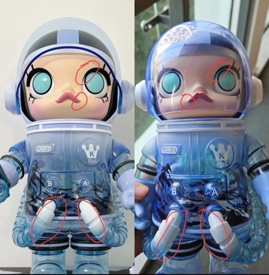 mega冰川400%假货Molly宇航员假货 冰川400%真假对比,mega的最明显的鉴别点是嘴唇和眼睛。 1.正品的瞳孔外圈和眼线是挨着的看不到眼白 假货的瞳孔外圈和眼线还有一定距离能看得到眼白 2.正品的嘴唇嘴角是翘起的 有小尖尖 ,假货的嘴角是圆的 3.身体上的氧气管,假货的合模线非常明显 。 #真假辨别 #拒绝假冒伪劣 #Molly #Mollymega #mega400 #冰川400