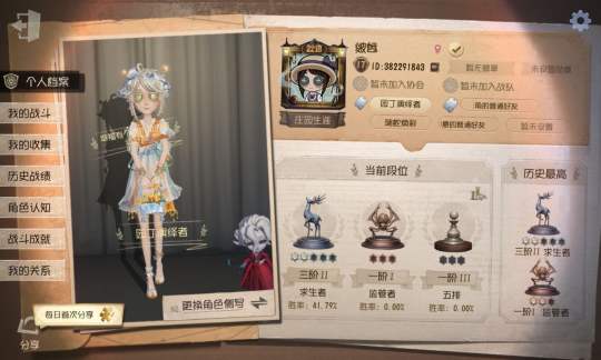 一片小树林08-28嗯,对,就是想起一个双字ID,结果起之后,很多都被占用了,这个是乱输的,我甚至不会读,嗯,对莫名其妙的就会发现自己改名成功,世界上好像没有第五人格单字ID可起了改天再花100个灯泡试下单字ID,玩第五不充钱,菜菜的别喷广西