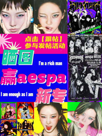 🎸"I AM ENOUGH AS I AM, I AM A RICH MAN."🎸 ⚡️吉他和闪电带来的视觉冲击,是独属于aespa的未来感 🏴️当星星纹上眼睛,黑曼巴是否会再次出现? 🎸敬请期待aespa新回归《RICH MAN》带来的全新故事 🔍【活动介绍】 在话题内发帖,讨论aespa回归《RICH MAN》相关内容,比如预告中最让你眼前一亮的妆造、你最期待的专辑配置、最pick的专辑收录曲、最令人难忘的打歌舞台等等,只要是与本次回归相关的,皆可发帖分享,赢精美专辑哦! 💅🏻【参与日期】 2025年9月2日-2025年9月21日 🏃🏻♀️【参与方式】 点击话题参与活动「跟帖」 在「aespa回归大发🎸」话题下参与发帖,分享新专《RICH MAN》的点滴 🎁【活动奖励】 1⃣️参与活动发帖,随机抽两位宝宝送出aespa新专《RICH MAN》一张(版本随机) 2⃣️凡是符合本次活动要求的优质帖子,均有机会获得1000-3000的流量扶持~ 🈺【开奖时间】 2025年9月22日 活动结束后将在本帖公布,请中奖用户在开奖后七天内回复完成兑奖哦~ ⚡️MY们一起来祝小吒吒回归大发吧!