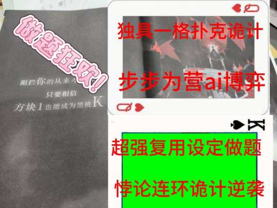 🏷️剧本类型|变格设定 动线做题 策略推理 长逻辑链诡计 🧸剧本人数|6 ⌚剧本时长|10h 🍞体验角色|玩家c 🎉综合评分|⭐⭐⭐⭐⭐✨ 🥞体验地点| @梧桐探案馆 案件:诡计:还原=5:5:0 😍😍 出类拔萃的dm:沐辰 💝推荐玩家:做题玩家 设定推理爱好者 手法爱好者推理玩家 🎃劝退玩家:介意设定推理的玩家,对设定理解有障碍的玩家,还原玩家 🐱难度系数:进阶到硬核 📚剧本简介:此作为未有来时系列的第四作,以未有来时系列的AI打牌部分作为灵感来源,根据扑克牌和扑克牌人的特性,创造了方圆转化 复制死物 修复回弹 分身术四大术法设定和扑克牌王国各大区域的生存,建筑规则,构筑了一个绚丽多姿的扑克牌想象王国。该作品对前三作的优缺点进行了扬弃,将设定复用精彩,诡计和做题设计精彩的优点无限放大带给了玩家一场做题盛宴! 2025年继雪夜城后体验感最好,最爱的剧本! 💝💝💝剧本优点: 💖💖💖步步为营的ai打牌博弈:这次打牌机制与世界观的融合的浑然天成,玩家需要对ai的出牌次序的判定底层逻辑进行详细研究,对如何让ai爆牌,如何取到关键的牌,何时取到关键的牌进行仔细推敲,从随机走向必然,绝对的纯逻辑流牌局推演!当我自己推理出全部的取牌和出牌顺序后成就感满满! 💖💖💖超强复用设定做题:该本的案件部分分为死者密室和凶器丢失之谜,每个部分都有方块案 梅花案 红心案 黑桃案四个部分,其中凶器丢失之谜的整体难度水平远高于死者密室四个之谜,死者之谜部分可能只是单个设定加建筑和转动等一系列的的动线复用,到了凶器之谜就是设定加各种小诡计+动线密室,还有有趣的推箱子,红桃案是个逻辑案,一道类似于数独规则的“纯逻辑题”,突破逻辑的点在于找到花色的排顺序,还要找到方块。鬼牌的填入次序。玩家要在短时间内通过不穷举的方法找到一整个解体逻辑链很难。 💖💖💖独具一格的扑克王国设计和游戏流程设计 剧本有独具一格的搜证流程设计,有meta破壁元素存在,并且通过玩家的互动做诡计和反转点,虽然不是剧本的主要卖点,但是也带给了玩家反转的惊喜和丝滑体验。扑克王国的凶器,建筑,世界观设定,花色设计等都和扑克人的特性紧密贴合。带给剧本界一次崭新的扑克王国诡计饕餮盛宴。 💖💖💖 核诡部分悖论谜面二十连拍!帅到极致,以破壁诡计带来的反转到ai打牌必胜法的逻辑起点,便开始基于此展开所有凶案的“长逻辑串联”,此刻整个本的“难度”开始彻底的迸发,一环接一环的长达二十多三十个的连环悖论谜面不断抛出,而且每个悖论谜面都会引发红鲱鱼双生悖论谜面,这种裂变式悖论谜面的迸发让剧本难度陡然升高,尤其是梅花案的反转。将设定复用用到了极致,到了最后的黑桃案,可以说是加强版的分身+归来石。其核诡部分的红鲱鱼设计堪称教科书级别! 💝💝💝出类拔萃的dm沐辰:我在8月15日上的沐辰首车。经过11.5h小时的鏖战沐辰对我们的逻辑封堵可以说滴水不漏,首车的逻辑熟练度比得上带过十车以上的d。给沐辰点赞!