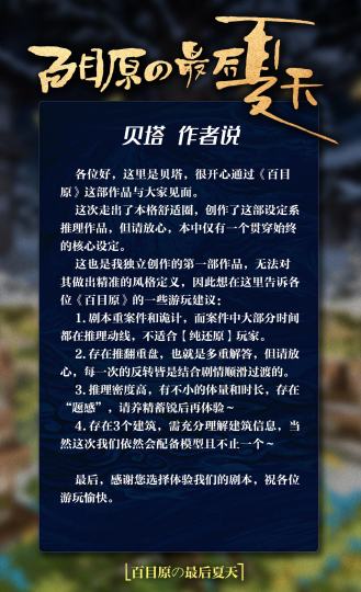 各位好,这里是贝塔,很开心通过《百目原》这部作品与大家见面。 这次走出了本格舒适圈,创作了这部设定系推理作品,但请放心,本中仅有一个贯穿始终的核心设定。 这也是我独立创作的第一部作品,无法对其做出精准的风格定义,因此想在这里告诉各位《百目原》的一些游玩建议: 1.剧本重案件和诡计,而案件中大部分时间都在推理动线,不适合【纯还原】玩家。 2.存在推翻重盘,也就是多重解答,但请放心,每一次的反转皆是结合剧情顺滑过渡的。 3.推理密度高,有不小的体量和时长,存在“题感”,请养精蓄锐后再体验~ 4.存在3个建筑,需充分理解建筑信息,当然这次我们依然会配备模型且不止一个~ 最后,感谢您选择体验我们的剧本,祝各位游玩愉快。