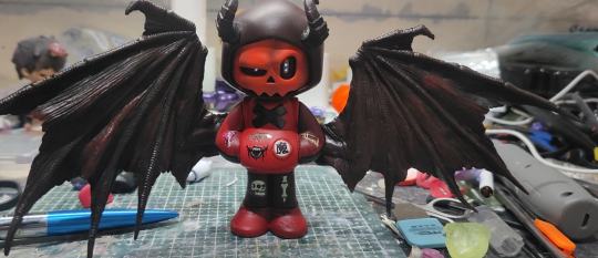 猩红骨架裹着暗黑卫衣,牛角帽檐压着邪性骷髅脸,蝙蝠翼展开的瞬间,连桌面都成了他的领地。 胸口的“魔”字贴、手臂的涂鸦刺青,每处细节都在说:“别惹我,但可以收藏我”。 玩潮玩的快乐,就是把“酷”具象成能捧在手里的恶魔🔥