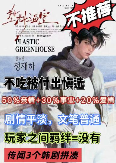 《塑料温室》,9.5H。这篇测评会带有很强的主观性,因为我拿到了一个爱情被付出的角色,但是没有办法,其他2对和npc,还有一对爱情线更弱,所以我也没有其他选择。然后这个本又重亲情,占到了50%,剩下30%事业,20%爱情。是的,如果不是最后2幕的爱情线描写,可能这个本我会给一个差评,因为实在太容易坐牢了(仅针对自己的角色)。 首先这个剧本说是难得的韩国背景题材,但是除了最开始的小剧场,有教你用韩语的方式去对话,自己整体的财阀+政权的故事背景,其他我并没有什么太大的感觉。然后,虽然大部分角色都穿插了亲情和事业自己爱情线,我自己甚至于还有一条宠物线,但整体给我感觉就是很平淡。故事线平淡,文笔也一般,导致经常看本时候一目多行也完全没有影响,因为就是有点流水账。什么叫做平淡?就是你知道有这样一个人,有这样一些故事,但就是无法让你觉得感动,宠物也是如此,我本身还是一个很吃宠物线的人,但无论是人还是宠物,离开的时候,我都只是觉得:哦,原来ta要走了。那为什么《没头脑》的宠物线能让我哭到崩溃呢? 再看事业线。我自己的视角里都不知道,原来我有当总统的潜质,突然在一个小黑屋里,dm和我说:我觉得你适合当总统。嗯???纳尼???为什么我自己本里完全没有让我感觉到,我有这方面的潜质?所以就莫名其妙…但真的事业线有啥进展么?抱歉,深入的没有,只是告诉你,你做了一些事情,也不管你自己有什么想法,反正作者就给你这么安排了。 那么爱情线呢?确实从开头就有描写这对所谓兄妹的“纠缠”,但还是那句话,就像在写生活日常,你甚至于可以当作是一篇篇的日记,没有任何深刻的记忆点。那兄妹纠结的点在哪?就一个简单的原因,怕人说…能不能给点好的理由?就这在那反复纠结个啥呢?好不容易中间说开了,没过多久,对位开始“人生觉悟”了。在此,我觉得作为对位女性角色比较出彩,因为体现了其个人思想及人生的成长,能吃到立意的女生会觉得很出色。但男生完全相反,如果你吃被付出,那或许也会被对方的举动感动,但我吃付出线的情况下,会觉得对方并未尊重我的想法。打的过程中我想到了另外一个本《我的神明朋友》杰克&玛丽,平淡的一生,却充满了感动。我想,好的文笔和故事,真的能让人感觉完全不同。 总体来说我个人觉得女生体验感会好于男生,且可能挑玩家,反正除了最后2幕,大部分时候我都在坐牢。