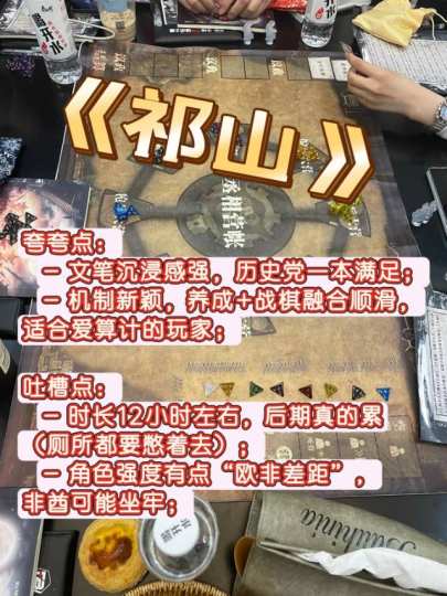 《祁山》:丞相,这次我陪你走一趟祁山! 作为个对三国题材完全没抵抗力的人,《祁山》这个本我真是蹲了好久,上周末终于凑齐一车开刷。 机制:养成+战棋,老六乐开花! 机制是《祁山》的重头戏,分前期养成和最终大战两趴: 养成阶段:有点像三国版“职场升职记”——议事、运粮、升官阶,官阶高的玩家能抢更多资源(比如兵种卡、阵法卡)。我们车有个老六扮猪吃老虎,暗搓搓攒兵,后期直接一波爆发。 但要注意:机制复杂度高,新手容易懵。我们车妹子全程问“这啥意思?”,DM解释到嘴角冒泡。另外,部分角色强度略失衡,最好找会调整平衡的店家。 角色:无边缘位,但选对很重要! 8个角色(5男3女)都没啥边缘感,但适配度是关键: 新手推荐:柳絮(操作简单)、李丰(抗压位);老骗子必冲:姜维、杨仪(技能骚操作多)。不过私聊超重要!有人闷着不说话的话,可能错过关键阵营线索,我们车就有人被“表面兄弟”背刺到捶胸顿足。 优缺点速览 - 夸夸点: - 文笔沉浸感强,历史党一本满足; - 机制新颖,养成+战棋融合顺滑,适合爱算计的玩家; - 吐槽点: - 时长12小时左右,后期真的累(厕所都要憋着去); - 角色强度有点“欧非差距”,非酋可能坐牢; 给玩家的真心建议 1. 组车配置:最好凑一车机制爱好者,新手太多容易崩; 2. 心理建设:别纠结历史!本子有魔改,当平行世界更快乐; 3. 私聊使劲冲:多试探队友,有人表面结盟背地偷家……我们车有人靠“木牛流马”苟到决赛圈,直接逆袭; 4. 挑店挑DM:提前问店家是否优化过机制(比如追加兵种卡平衡强度),否则容易高血压。 总结:像陪丞相走了一趟北伐 《祁山》适合愿意花时间沉浸的玩家——如果你喜欢《三国杀》式博弈冲它不亏! 最后一句忠告:千万别完全相信你的队友,毕竟在祁山,活到最后的才是赢家!