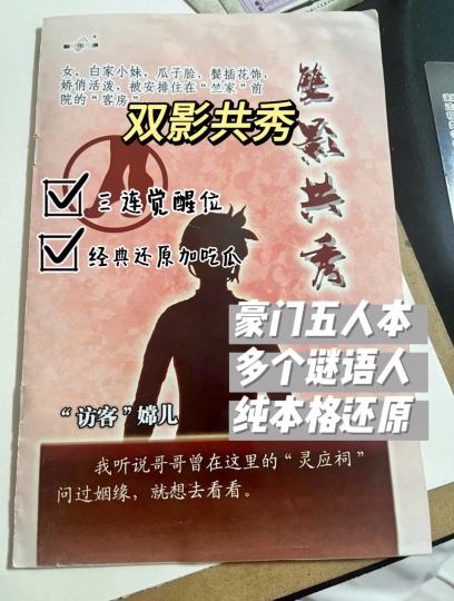 双影共秀 🖤剧本类型:还原、豪门、推理 🩶剧本角色:3️⃣女2️⃣男 🤍剧本时长:6.5-7h 🤎体验角色:嫦儿 💭故事背景: 民国初年,月秀村有一映天湖,相传数十年前湖中有一水妖飞升失败,从此留在湖底潜踪修炼,村民遂于湖畔建了一座灵应祠供奉“鲛婵”。 哪知有一日,“鲛婵”的祭赛中竟要用到“竺家”的童男、童女,引来一场血雨腥风…… ✅说说剧本 这个本依然保留了豪门系列最精彩的复杂人物关系推理还原,“谁是我爸爸,我是谁,我爱的是谁”,永恒的推理主题依旧让吃瓜群众盘的愉快 叙诡: 一共就五个角色,就有三个谜语人 谜语人难度:【功靖】>【嫦儿】>【往琴】,每个谜语人都是“觉醒位”,如果能把这三个角色盘明白,对还原会有很大的帮助。 还原: 整个故事时间跨度比较长,差不多有40年的时间线。三幕的时间都不同。 人物关系看似简单,实则复杂,在找爹、找妈的同时还要找自己。 推理: 凶案数量不算多,整个案件不算难,锁凶范围很小,稍微还原下故事,凶案都不会盘错。 🔔剧本体验 依旧是大量叙诡,难度比之前的豪门略大一点点,最好在精力充沛、时间充裕的时候来打,DM不扶车至少要七个小时左右,后面有一点掉线就跟不上了,会浪费这个本子。霓娥这个角色视角很清晰,没有太多的叙诡,算是少有的清晰视角的角色。 很多人会介意明凶本,但其实豪门本更多的是盘人物关系,还原事件真相,推凶部分没有很大的占比,凶案只是故事的一部分,所以拿到凶手位其实不用过多的紧张。而且是七个凶案吧,不只有一个凶手,所以不用太有压力。 建议一代代来推,可以从故事最开始的第一代人物关系往下盘,这样还原过程会清晰些。另外,知道豪门都是本格本,方向就不会太歪。 ❌缺点:人物确实太多太复杂了,DM虽然说不扶车,但其实还是在暗暗提示,因为如果一点不扶的话真的非常非常令人头疼……而且这个本案件很多,有很多凶手要盘,所以大家都会有可能是凶手,也就是意味着每个人都会或多或少地藏线索……就导致我全本都感觉自己视角缺失,也不知道自己是谁,也不知道对方是谁……而且瓜也没有想象的多,打完满脑子只有疲惫…… 🆗整体评价: 除凶案意外的内容务必好好分享,盘清楚人物关系比什么都重要‼️推荐豪门爱好者、还原选手上车,更适合喜欢民国/硬核/还原的玩家,但可能不太适合想吃很多瓜/对人名不敏感/吃线索的玩家,容易觉得有点坐牢 👫选角攻略: 🚺霓娥:竺家妾室,信息位,视角清晰,辅助还原位 🚺往琴:竺家小姐,谜语人,有爱情线,信息中等,辈份小,难度中上 🚺嫦儿:竺家访客,谜语人,有爱情线,信息中等,难度偏大 🚹银蟾客:灵应祠祠主,辈份最高,信息中等,新手可拿 🚹功靖:邬家少爷,谜语人,有爱情线,信息中等,难度偏大 全员角色转换,没有明显的边C,但是难度有差异。谜语人难度大一些,不推荐新手拿。