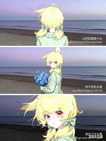 豆包这次很乖指定是这个帮我生成图片:一组三宫格艺术感写真图,海边写真图,场景为海边沙滩,天空呈淡紫与灰色渐变,海面平静。画面中有人物和参考图一致,第一张为近景,站在沙滩上的背影,头发被风吹起,添加中英文字幕“山的后面是什么 - What's on the other hand of the mountain”;第二张是手持蓝色花束,侧身站立于海边,添加中英文字幕“你不用告诉我 - you don't have to tell me”;第三张是特写,头发随风飘动,添加中英文字幕“我自己会去看 - I will go and see it myself”。整体色调清冷,营造出文艺且充满自我探索情绪的氛围。三张图合成一个三宫格。原比例。
