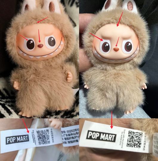 Labubu4.0心动密码字母B,真假对比 1发际线,假货发际线更“秃” 2鼻子轮廓,假货鼻子上色范围多,颜色偏浅 3.眼睛,正品眼睛两种棕色 色差小,假货色差明显 4.水洗标,正品水洗标材质有格纹,假货水洗标较光滑。且字体粗糙