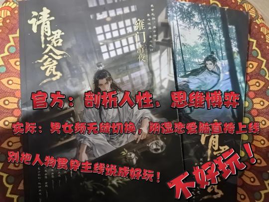 一直外传“请君的F4比恋陪位好玩”,我只能说别信,因为F4一样也不好玩!真的不要把这个角色在主线剧情里当成好玩了。虽然另外两个恋陪位,基本是出去另外开个小黑屋全程呆里面都行,对于故事推进没有很大影响。 请君在我这里的评价基本就是梦到哪儿写到哪儿了,有些视角挺新的,奈何文笔实在是糟糕完全吃不到。 接下来全程剧透: 体验的角色是雍门清夜,一个官方主打“喜欢剖析人性、享受思维博弈、能沉下心阅读和品味大量信息”的角色。实际上是个精英人设、喜欢刺激、其余设定空白的书穿书角色。我不反对这个设定,甚至书穿书的反转出来以后,我其实挺惊喜的。我个人理解,作者想要给到的是,原本不在乎的情感,高高在上的身份突然被拉了下来的反转或者说悔意。但是从我的体感来说,前面写得过于抽离,雍门清夜从来没有把自己代入到身份里游戏,导致我也很难带入,每一条作者想让我吃到的线都如同隔靴搔痒一般,一点情绪波动都起不来(除了得知自己是书穿书那段)。 文笔上,本身B本上来就是对人物未知事件的回顾,信息量很大,甚至可以说是在玩家心中构建人物形象重要部分,但是B本的小本穿插毫无意义甚至是负收益,直接拿掉小本来理解B本毫无差异,加了小本之后感觉像是作者吃了菌子,梦到哪里写哪里。 首先说爱情线吧,你不能说顾先生这个人天生恶人吧,只能说是无感而已。虽然前面有写到他做手术的时候一度想要送病人走,但是也到不了看到老婆也会杀人就开心到爱上的地步吧,我的体会是这一步只是到了“你很有趣”这一点。然后就是贯穿爱情的任务线,从一开始顾的任务是:成为男主,进一步来说是夺得皇位。为此他不惜伤害皇甫景澄,在他看来其实对自己不错,有那么一点不忍心下手的朋友。然后碰到赤华之后:我们的任务不冲突欸?我可以做驸马辅佐你上位诶,这样也可以完成任务。从男频无缝衔接变成了女频男主是吗?前后人设能不能稍微统一一点……还是说从这一刻开始,雍门的行为就变成了恋爱脑模式,A本的淡人人设跑哪里去了?然后到了最后书穿书的部分,玩家很被动的接受到了一切已经注定的消息,然后给了一张大卡,这样的感觉确实蛮NPC的,为了让角色“好玩”起来,不应该让雍门提前给赤华铺垫埋刀子吗?ps,用周幽王烽火戏诸侯来类比赤华和清夜的结局,这真的吃得动吗?有了这个类比,我结局一点感同身受都没有。 亲情部分,主要在第二本里,是属于落差非常大的一条线。母亲线着墨不多,父亲线在B本里其实还挺好吃的,尤其是很容易被玩家打出愧疚线,因为A本里的雍门是不知道有亲子关系的,所以没有好好喊一声爹是我的痛点。但是直到大反转出现之后,这一切就变成了,他对我从来都是任务,没有真心;还有类亲情的仆人线,太浅了吧,而且雍门非常努力地去把自己抽离出剧本同情,导致线根本吃不动…… 友情线,其实皇甫对雍门没做错啥,甚至还算是个好兄弟。结合从男频文男主转到女频文的男主,二人其实不至于到不死不休的状态,甚至雍门自己的本里都是对兄弟有愧疚的,但是行为却是“送他们一家人团聚”,真就一点活路都不给玩家留? 总结感受是,作者不要把事业脑骗进来杀了,如果要让男玩家切换恋爱脑打付出,可以明着来……我可以避雷的。