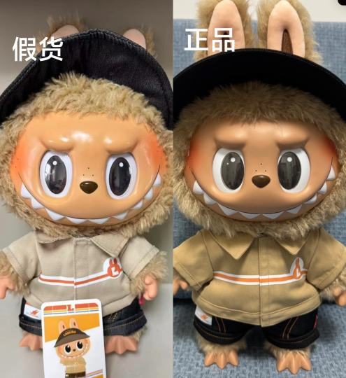 便利店大娃Labubu真假对比 假货很明显脸部油光,眼睛轮廓不对,毛发粗糙,衣服材质和颜色不对。 正品一代黑皮和正品便利店大娃除了衣服有区别,一代黑皮脚底没有钢印,便利店大娃脚底有钢印,还有水洗标上的名称是不一样的。
