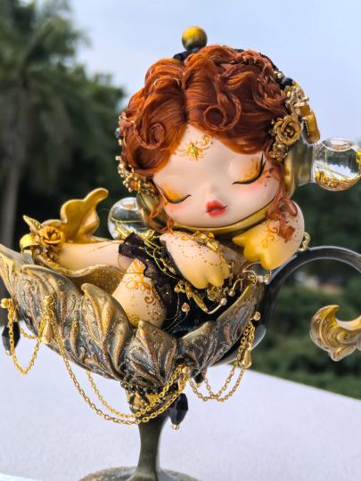 她是暗夜中蜷在杯中的少女, 红发如焰,金纹如星, 每一道鎏金纹路都在诉说不被定义的浪漫。