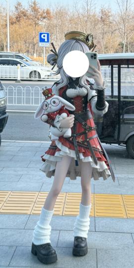 宝宝指令 帮我生成图片:原比例,场景纪实写真,女生穿着第1张图片同款服饰,搭配白色堆堆袜和厚底鞋,腿细,左手举浅色手机对着玻璃自拍,背景为城市街道(包含枯黄树木、行驶车辆、白色护栏、蓝色"P"停车指示牌、三轮车、灰色人行道与黄色盲道砖),画面风格日常随性,色调清新,随手拍,突出玻璃窗质感,还原逛街后街边自拍的生活氛围,衣服细节和项链保持不变。9:16[赞]03-15・贵州