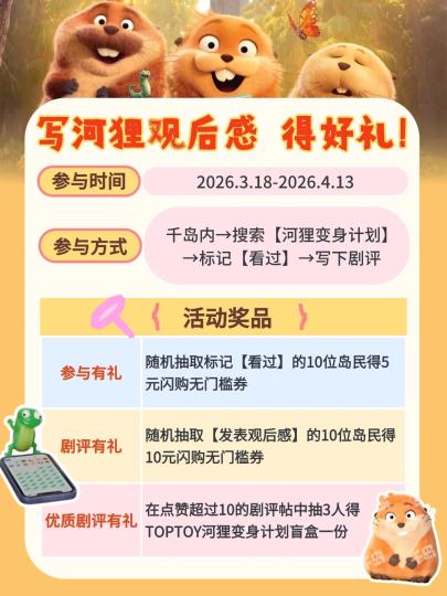 🦫圆滚滚的仿生河狸梅宝邀你写观后感啦!承包你的观影小惊喜,正版盲盒等你抱回家~ 🌸 赴一场湿地守护之约,聊聊你心中的梅宝、乔治、汤姆,还有那些触动你的瞬间吧! ⏰活动时间:3月20日起至4月13日 📋活动规则: 在千岛APP内搜索【河狸变身计划】,在作品页标记【看过】+并发帖评价 不限对剧情的解读、角色的分析、主题的探讨,言之有物情真意切即可 🏆奖品设置 1、【看过有礼】随机抽取标记【看过】的10位岛民得5元闪购无门槛券 2、【剧评有礼】随机抽取【发表观后感】的10位岛民得10元闪购无门槛券 3、【优质剧评有礼】在点赞超过10的剧评帖中抽3人得TOPTOY河狸变身计划盲盒 ⌛️开奖时间:4月13日,于本活动贴内公示获奖名单,5个工作日内发放奖励 🔥爆火tips🔥 好的正文首句+图文并茂(附上梅宝、乔治名场面截图更吸睛),记得分享给朋友们来点赞哦~ 艾特@二次元在千岛 ,好内容会助推上热门哦~ ‼️注意事项: 每位用户仅有一次获奖机会,但可以多次撰写观后感参与活动; 内容符合法律法规及平台规则,禁止搬运抄袭刷数据等违规内容; 👇👇👇点击卡片直达,和梅宝、乔治一起,分享你的观影心声,解锁盲盒好礼吧!