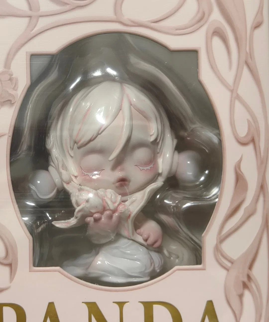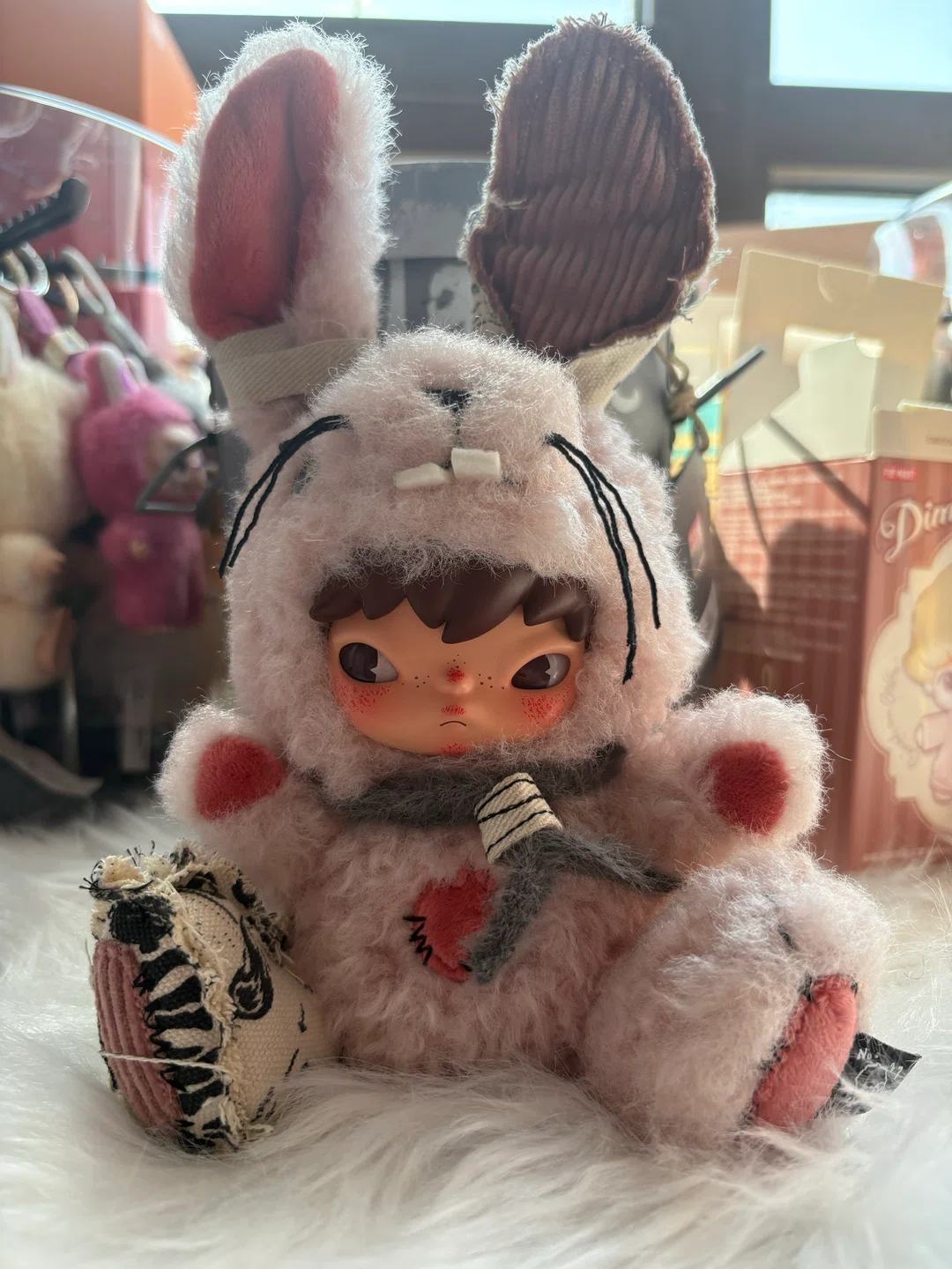🐰 小野兔毛绒玩偶 这是泡泡玛特HIRONO小野系列的小野兔毛绒公仔(常规粉色款),整体是充满废土童话感的治愈设计,细节拉满: 🔍 外观与造型 - 主体造型:玩偶高约23cm,是穿着兔子连体毛绒服的小野形象,整体以浅粉色卷毛绒为主体,软乎乎的质感拉满。 - 头部设计:- 兔子头套还原了兔子的标志性特征:黑色刺绣胡须、两颗白色兔牙、黑色鼻头,造型软萌又带点做旧感。 - 两只兔耳设计不对称:左耳内侧是珊瑚红色毛绒,右耳内侧是做旧灯芯绒面料,边缘做了毛边、破损处理,充满复古流浪感。 - 头套下露出小野的脸:深棕色短发,脸颊晕染着橘粉色腮红,眼神淡漠又带点倔强,是小野标志性的“厌世感”神态。 - 身体与四肢:- 脖子处搭配了灰白条针织围巾,围巾自然垂落,胸口还有一处做旧补丁,用红线手工缝补,强化了“流浪感”。 - 两只手/脚的掌心是珊瑚红色毛绒,用黑色粗线做了缝线装饰;左脚掌拼接了做旧灯芯绒+黑白涂鸦布条,边缘毛边外翻,细节感十足。 - 右脚外侧有小野专属的黑色标签,标注了编号,是正品标识。 - 包装细节:玩偶被收纳在做旧风格的金属桶中,桶身印有“Hare”字样和复古标识,桶身做了做旧喷漆、金属搭扣+麻绳设计,氛围感拉满,既是包装也是展示容器。 ✨ 风格与设计亮点 - 核心风格:走废土童话+流浪治愈路线,用做旧、破损、补丁、毛边等设计,打造出“被温柔修复的小可怜”感,软萌的毛绒和小野的厌世脸形成强烈反差,是小野IP的标志性设计。 - 材质工艺:全身采用聚酯纤维毛绒填充,手感柔软蓬松;灯芯绒、针织、刺绣、手工缝线等多材质拼接,细节丰富,质感高级。 - 设计巧思:不对称兔耳、做旧补丁、专属标签等细节,让每一只玩偶都有独特的“故事感”,既适合摆件展示,也可作为挂件使用。